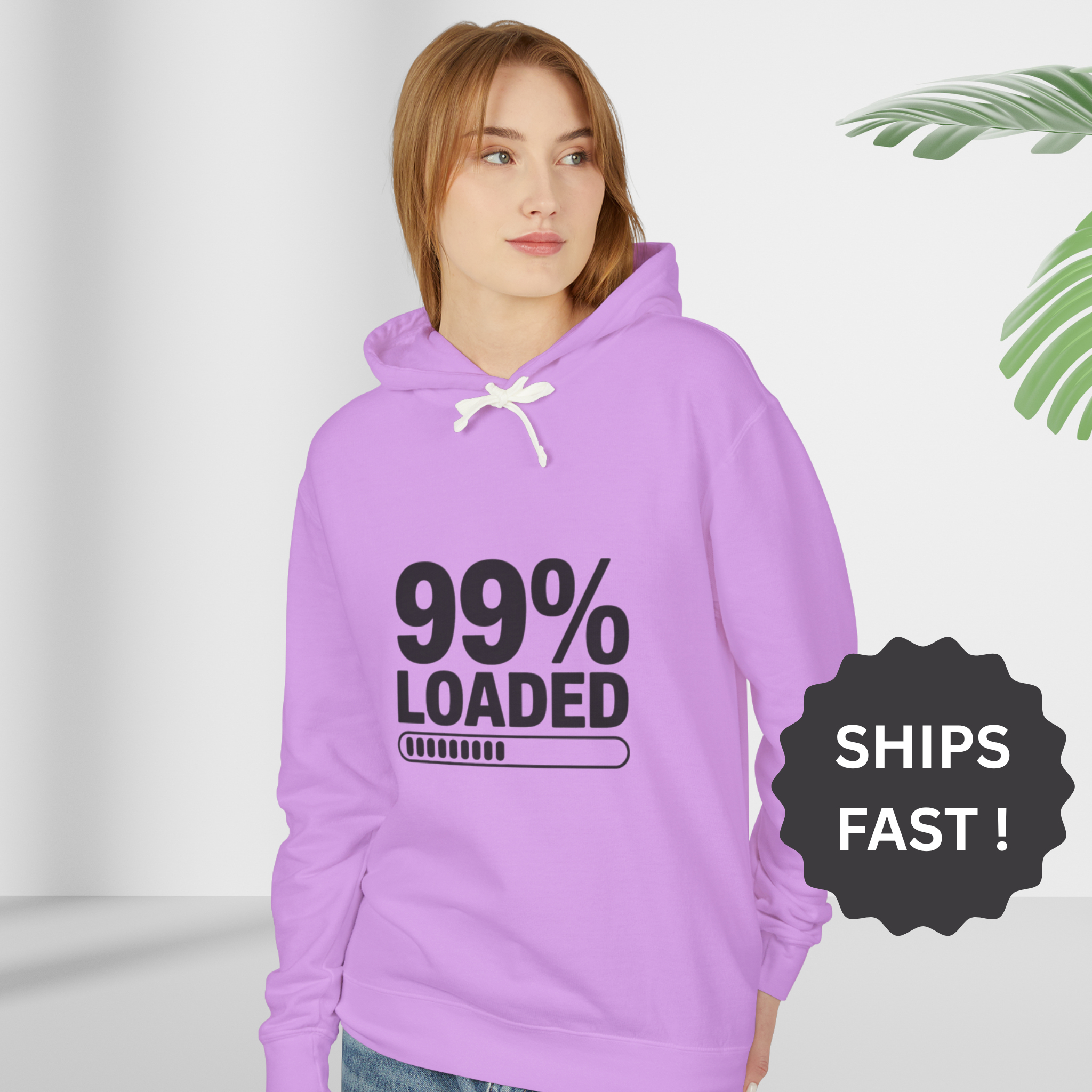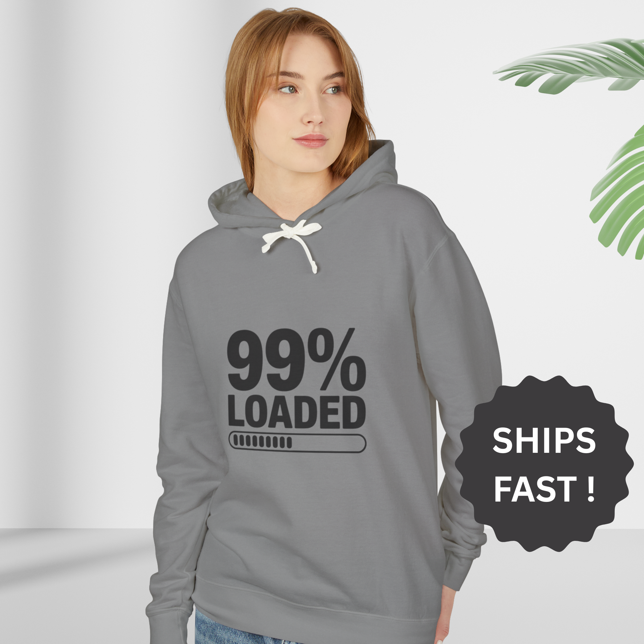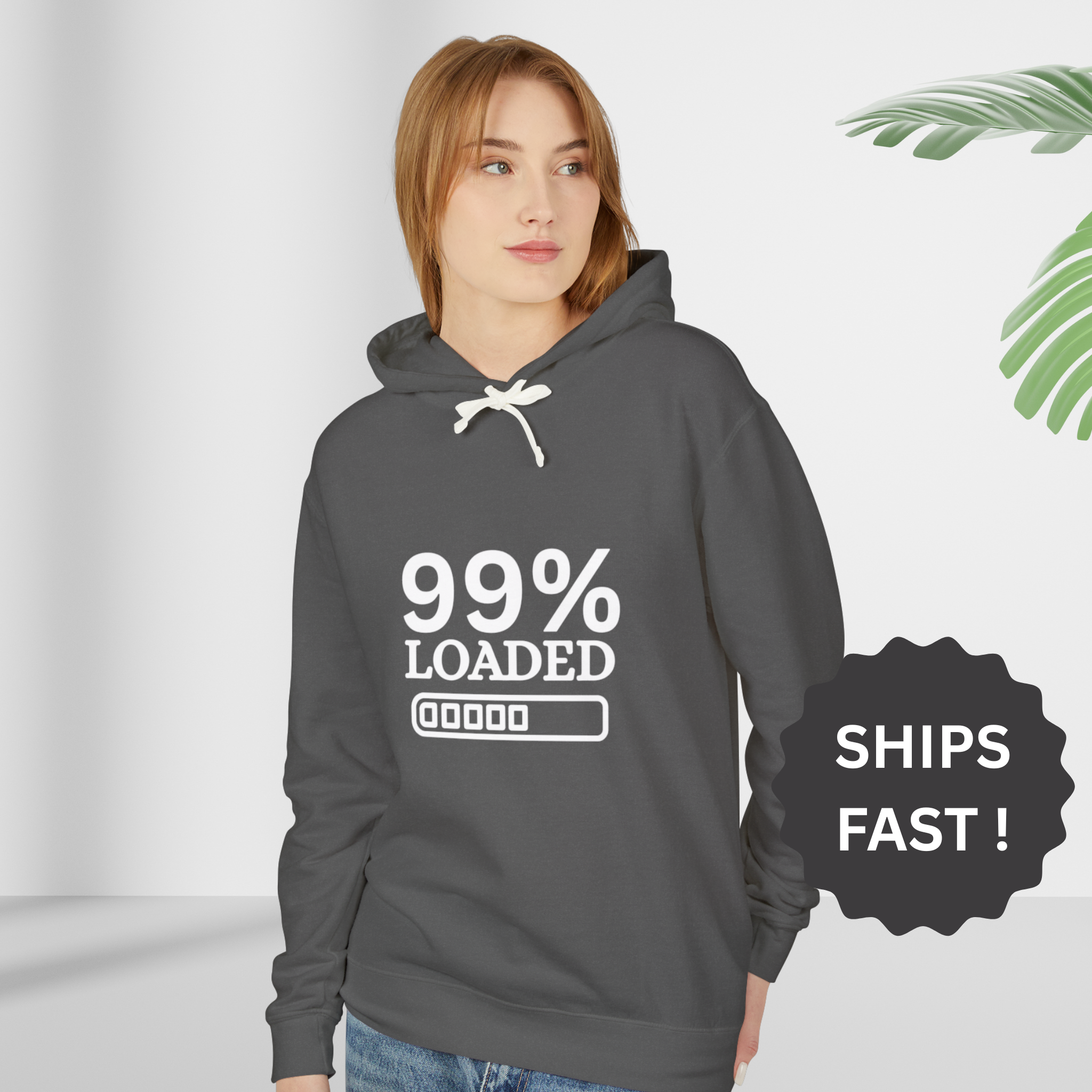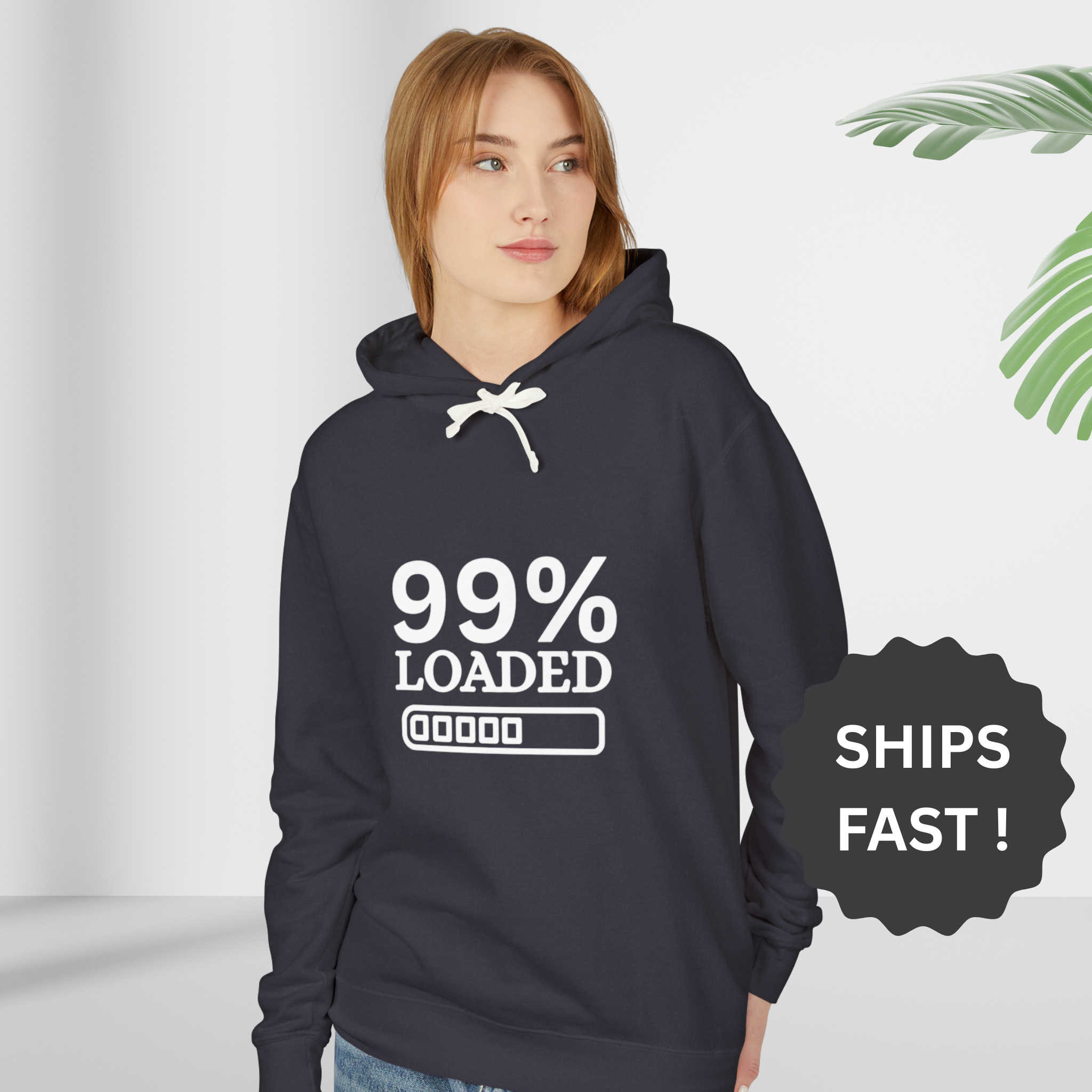 Soft, roomy, and a little bit playful — this lightweight hooded sweatshirt celebrates the quiet thrill of expecting. The ‘99% Loaded’ design reads like an inside joke between parents and friends: it’s the wink you wear when you’re counting kicks, planning names, or about to drop the big news. The fabric drapes gently over a growing bump, the jersey-lined hood and relaxed cut keep you comfortable on long doctor visits or lazy weekends on the couch. Subtle details — like the smooth ring-spun cotton and clean pigment dye — give it a lived-in, cozy feel that matches those late-night cravings and weekend gaming sessions with pals. Give this sweatshirt space in your rotation for reveal photos, baby shower mornings, and days when you want to feel both seen and comfortably you. Product features - Lightweight 100% ring-spun cotton for soft, breathable wear - Jersey-lined hood with flatcord for cozy coverage - Relaxed, oversized fit that accommodates a growing bump - OEKO-TEX low-impact dyes and U.S. Cotton Trust Protocol sourcing - Rolled forward shoulders for improved comfort and mobility Care instructions - Machine wash: cold (max 30C or 90F) - Do not bleach - Tumble dry: low heat - Iron, steam or dry: low heat - Do not dryclean.